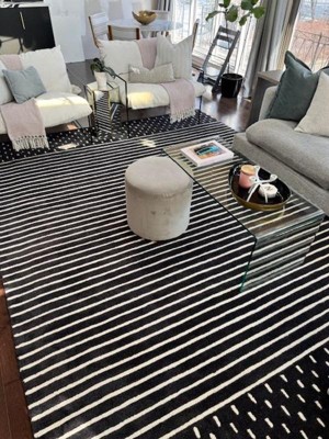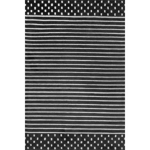 (This review was collected as part of a promotion.) I was initially hesitant as this rug is a strong pattern with high contrast, but I was pleasantly surprised on how well it went with the decor. It's kid and pet friendly and is already hiding one accident spill my son had on the first day of putting it down. In the images it reads black, but it is truly a charcoal grey colour in person.