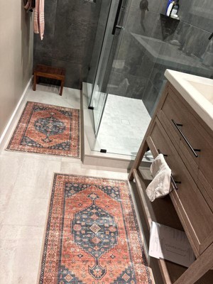 [This review was collected as part of a promotion.] Just as described - looks like a vintage Persian rug. Perfect for bathroom. Rubber on back. Very thin, more like a flexible matt. Washes nicely.