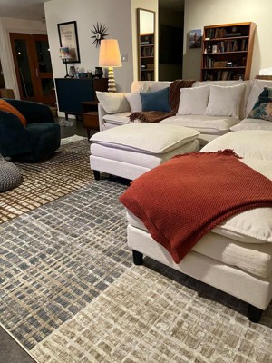 Ordered this rug hoping it would work in our decor. We are so happy! It has a contemporary vibe with a structural design. It pulled the room together. The colors are more vibrant IRL than on the website. It's folded when delivered so lay it out and give it room to relax. We steamed it to help soften the creases. Every day we thank ourselves for this purchase.