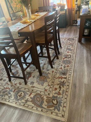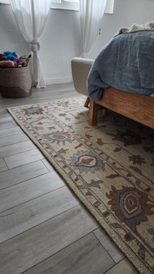 [This review was collected as part of a promotion.] We had just laid a new wood floor with a dark reddish walnut color and this light-colored rug with soft hues of blue, terra cotta, and olive is a beautiful complement. We've since learned that we don't see dog hair like the other rug showed and when vacuumed, the dog hair comes right up whereas the other rug held onto the hair. The closed loop pile is cushy, comfy, and just looks neat and clean. Highly recommend.