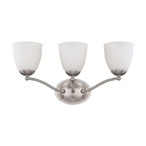 Collection: Patton, Material: Metal, Width: 21", Height: 10", Depth: 7.5", Number Of Bulbs: 3, Wattage: 100 Watts, Moisture Rating: Damp Rated, Desc: The classically inspired Patton series finished in brushed nickel or prairie bronze and accented by frosted glass shades, is the largest and most versatile of our new design collections. In addition to the usual configurations, Patton features a 4-light vanity, a flush dome and 3 and 5-light chandeliers which are available in both arm-up and arm-down configurations. There is nowhere these fixtures cannot go. Rated: Damp.,