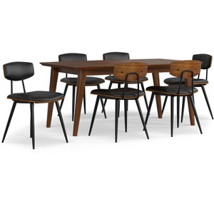 Elevate your dining experience with the Nyla and Tierney Dining Set, a perfect blend of mid-century modern sophistication and contemporary style. The Nyla Dining Chairs, upholstered in sleek black vegan leather, offer sculpted comfort with curved backrests and solid wood veneer accents. Paired with the generously sized Tierney Dining Table, this set accommodates up to 6 guests comfortably. The table's boat-shaped walnut veneer top showcases the natural beauty of wood grain, protected by a durable hand-applied lacquer. Supported by robust legs and an iron frame, this dining set promises both style and longevity. Whether for everyday meals or entertaining, this versatile ensemble adds timeless elegance to any dining room or kitchen, making it the perfect centerpiece for your home.