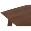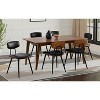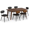 • Mid-century modern dining set features a 66-inch walnut veneer table and black vegan leather chairs for a sleek, contemporary aesthetic.