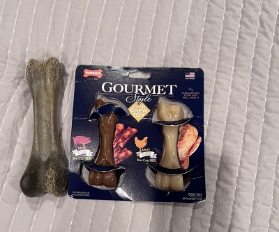 Inspired by that distinct "this is the life" feeling of satisfaction, Nylabone's Gourmet Style chew toys are made to wow flavor-obsessed dogs who crave a new type of chewing experience. Applying decades of expertise, this latest formula is uniquely crafted with enticing flavor bits you can see—leaving even the most particular dogs with a sense of chewing gratification!