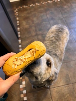 [This review was collected as part of a promotion.] An instant hit. A easily packaged rubber made peanuts shaped bone passed the durability quick test with this chewer! Product can be filled with larger treats or spreads for easy entertainment and activity. Even when empty this guy carried it around for a good hour!