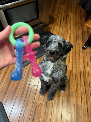 [This review was collected as part of a promotion.] This is such a fun teething toy for puppies! It has a faint scent which I’m sure is much stronger for dogs – I appreciate that it is not too strong for humans to smell. The design is fun and I love how this toy has different shapes. It’s not heavy and perfect for smaller puppies. I also appreciate that it’s not hard plastic and has a little bit of a rubber feel - that lets puppies chew without getting sharp plastic edges and hurting their gums/teeth. Well, this is a puppy toy, my adult dogs love it also – it is strong enough to withstand their chewing, but gentle enough not to be hurting them.
