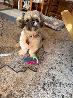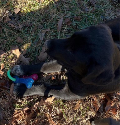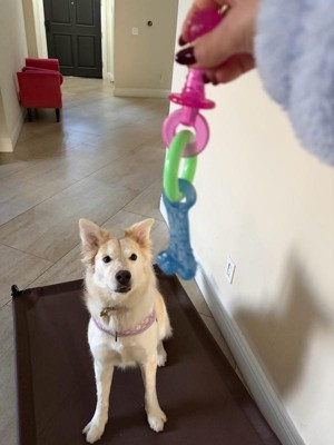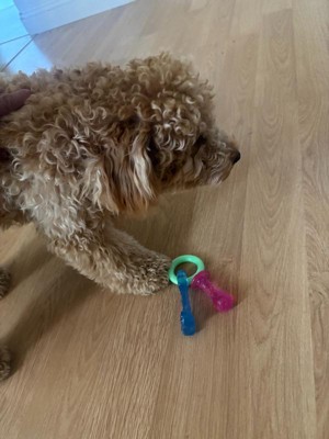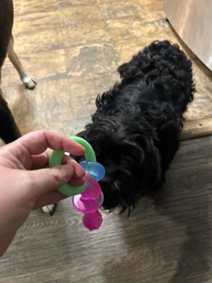 [This review was collected as part of a promotion.] Finally a puppy toy that has held up to their incredibly sharp puppy teeth! We got two rescue pups a month ago and it’s been relearning process on how much they chew and how destructive they can be! They’ve chewed through so many toys and supposedly indestructible chews. They’ve either destroy them immediately or get bored fast. You can easily see on the teething toy that they have definitely tried to chew it to pieces but haven’t been able to! I appreciate that it’s not coming apart in their little mouths potentially causing a choking hazard. And there’s No squeaker so it’s nice to play in the house too without the extra noise. It was so hard to get clear pictures of them with it because they kept playing Keep a Way with each other. Ha ha