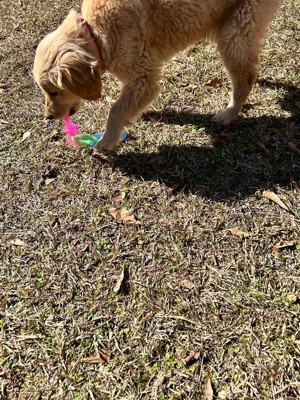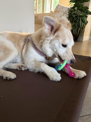 [This review was collected as part of a promotion.] I have a one year-old husky mix that absolutely loves to chew! Luckily, she only choose the toys I give her :) this toy is a 10 out of 10! It is a super durable plastic so I don’t need to worry about her chipping pieces off and swallowing it. She loves to play around with it. And the shape is great. I also love the colors! Overall, this is a great toy for a great price for your dogs.