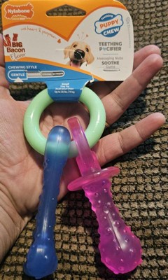 [This review was collected as part of a promotion.] I received Nylabone puppy chew teething pacifier dog chew toy bacon small from influencer. My grand puppy loves it, it last stays clean, great grip and the scent makes him go crazy.