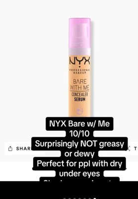 [This review was collected as part of a promotion.] ⭐️⭐️⭐️⭐️☆ (4/5) I finally tried the NYX Bare With Me Concealer Serum, and my first impression is that it’s very lightweight — almost feels like skincare. It takes a little while to dry down, which I actually like because it gives me time to move the product around and blend it evenly. The coverage is light to medium, perfect for natural makeup days. If you’re looking for something full coverage or fast-drying, this might not be for you, but if you love that fresh, skin-like finish — it’s definitely worth trying!