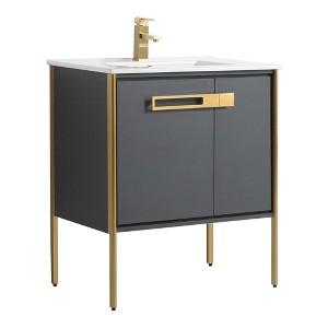 I bought this stylish vanity a few weeks ago and had it installed in our spare bathroom. It fit perfectly and looks great. I’ve had many compliments from family and friends. The part that stood out was the white ceramic top with gold trim. I would highly recommend to all!