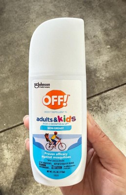 [This review was collected as part of a promotion.] This insect repellent off for adults and kids is great non greasy and really works! It is easy to apply and fragrance free. You can use on kids as early as 3 months as well as adults.