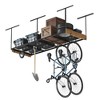 The rack can be mounted either parallel or perpendicular to the direction of ceiling joists. Note: Installation requires two people and basic tools, including a ladder, drill, tape measure, eye protection, and a stud finder. This rack must be secured into traditional lumber ceiling joists—do not install using drywall anchors or into engineered I-joists.