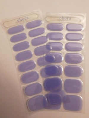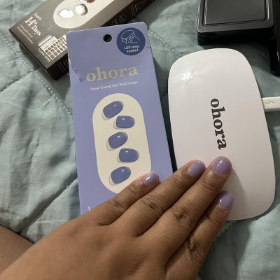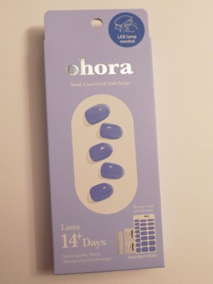 Add see-through color to your nails with our tint syrup line. Features a periwinkle blue translucent gel. This design features a translucent, glass-like appearance, creating a see-through effect rather than a solid color nail design. Ohora Semi Cured Gel Nail Strips offer salon-quality nails in minutes. Achieve 14+ days of long-lasting durability and a professional finish at home, showcasing Ohora's dedication to top-notch quality. Ohora Semi Cured gel nail Strips offer an effortless process—simple application, filing, curing, and removal—perfect for beginners and pros alike.