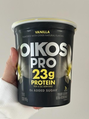 [This review was collected as part of a promotion.] Oikos Pro 25 grams of protien and 0 grams of added sugar is one of my favorite snacks. I usually enjoy it with some honey, granola, and fruit on top of it!