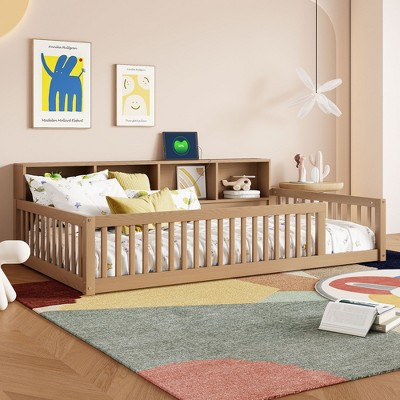 Okak Montessori Floor Bed Twin XL,Solid Wood Bed Frame with Built-in Storage Cabinets & USB Charging Stations, Low-Profile Kids Bed for Bedroom