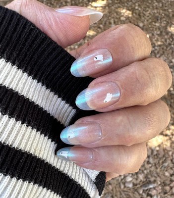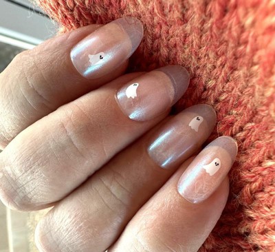 [This review was collected as part of a promotion.] I really loved these ghost pressies. The little ghosts are so cute. Very subtle, but cute. The pressies are really transparent with an iridescent shimmer to them. I got compliments from a friend on how cool the iridescent effect was, especially in the sun! Even though these are Instant Mani/glue pressies I applied them using the sticky tabs and they were really solid. I pretty much only use the tabs on all types of O&J pressies and they worked really well with this set. I was a bit worried about seeing the sticky tabs under the very clear nail base but it looked really good. The nails were pretty long on me but felt very natural. I had them on for 5 days with no issues at all - only removed them because I was ready to paint new colors! I would absolutely recommend these to friends looking for a Halloween mani, but not something that screams Halloween!