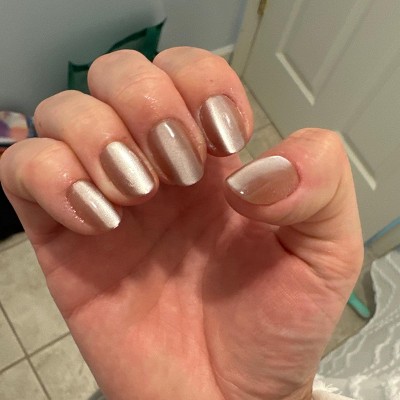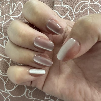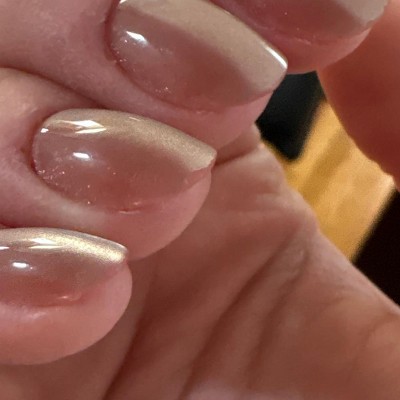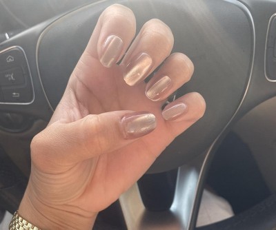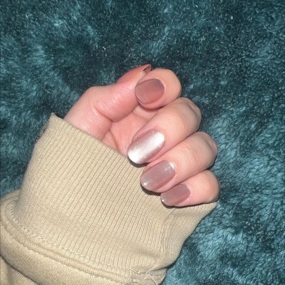 - A dusty rose neutral mani with the coolest magnetic velvet effect in a short round shape.