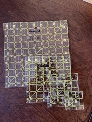 [This review was collected as part of a promotion.] The Omnigrid Square Ruler Value Pack includes the most needed squares of any quilter: 9 1/2”, 6 1/2”, 4 1/2” and 2 1/2” squares. The 1/2” allows for the standard 1/4” seam allowance on the sides. The markings are yellow and black on clear plastic which allows you to see through to the fabric below. The edges are a clean line to allow for rotary cutting or marking. A great value!