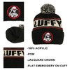 Show off your pirate pride with this black One Piece cuff beanie. Featuring an embroidered image of Luffy in a red circle on the cuff, bold “Luffy” text on a white stripe across the front and back, and a black and white pom on top, this beanie makes a standout addition to any fan’s collection. Made with acrylic knit materials with a jacquard crown, it provides warmth and durability. This beanie is one size fits most. For the best care, hand wash it in cold water and lay it flat to dry.