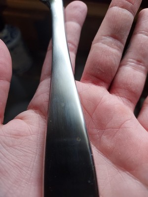 Good flatware, but for some reason, I believe the display pieces, are oh so slightly different from the other pieces. See photos. I only notice this when I stack them and noticed one didn't stack well. And yes, we normally stack them in the drawer. Not a bad set, esp since it's 18/0 steel (lower grade, but a must for nickel allergy sufferers like us). But for the price, there are better options out there if you are not restricted to 18/0 steel. (Note: Flatwares in use for 3 wks as of this review)