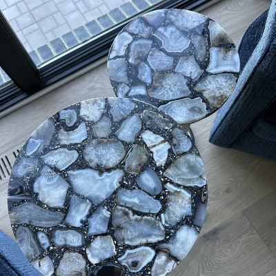 These tables are beautiful. I am a rock collector so the tables are real agate, the natural colors which are white, cream, gray, black, rust, brown and bluish. When you have a lamp on, on the table, you can see through some of the stone and see the crystal shining also. I got mine around Thanksgiving so I got a great deal. Other sellers sell these tables for hundreds more. And the quality is great. These are thick, chunky tables. I just absolutely love them!