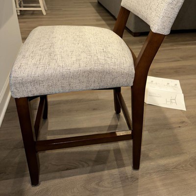 This open back counter stool has a padded backrest and seat, wrapped in a black and white woven fabric, offer long-lasting support while dining or enjoying conversation over a cocktail or glass of wine. Simple and streamlined with fresh, thoughtful details. Seat back and cushion features stain resistant fabric that is ideal for spill-prone areas like the dining room, eat-in kitchen and breakfast nook. The straight-lined legs are finished in a dark walnut stain, giving it a sleek look that complements any decor. Some Assembly Required. Please note that fabric and wood colors may appear slightly different due to variations in lighting or screen settings.