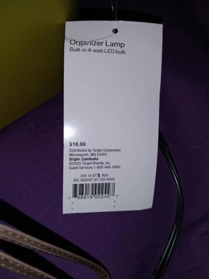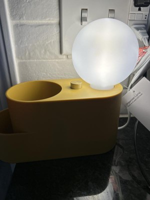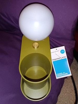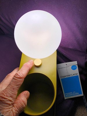 The mustard colored LED Orb Shade Organizer Lamp by room essentials is so cute it’s perfect for that small nightstand you have it doesn’t take up a lot of room. You just touch the gold button to turn the lamp on and off Put off a lot of light