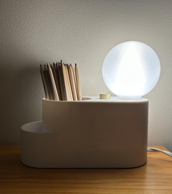 This is a cute lamp. I use it when I am doing Zoom calls for a nice soft light. I has a touch on/off button and I can put my pens and pencils in the lamp to keep my workspace tidy. It is a simple design.