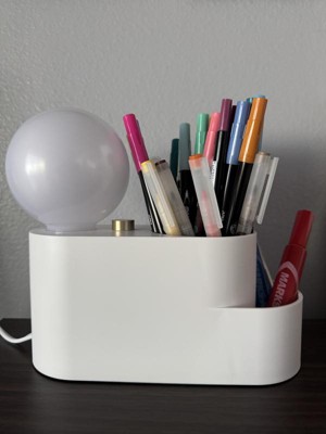 This light-up organizer is very versatile. It is perfect for holding work desk supplies, makeup brushes, or even small tools. The plastic bulb and the organizer itself are easy to wipe clean. The on/off sensor is conveniently located next to the bulb so you don’t have to worry about knocking anything over trying to turn the power on or off. The power cord is a good length, and the bulb is bright enough to be useful without being too bright.