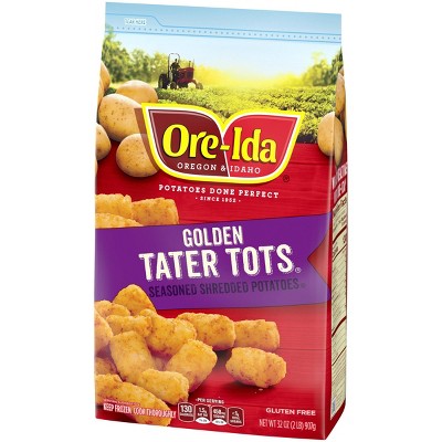 Ore-Ida Golden Tater Tots make it easy to enjoy deliciously seasoned potatoes at home. Crispy and golden, our frozen tater tots are made from freshly peeled, American grown Grade A potatoes. Ore Ida gluten free tater tots have a crispy outside with a fluffy inside for the ideal blend of textures to make your next family meal a success. Toss our frozen tater tots on a baking sheet to prepare them in the oven according to package instructions for perfectly golden tater tots. An American classic, Ore Ida tater tots are great for dipping. Serve them with burgers, or get creative with loaded tots topped with cheese and bacon. Our oven baked tots come sealed in a 32-ounce bag to help lock in flavor. If you like our Ore Ida frozen tater tots, try Ore-Ida frozen potatoes, french fries and hash browns.