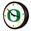 This premium University of Oregon Retro Lighted Wall Clock will be sure to add the finishing touch to any room in your home or office. This piece is injection molded and features a high-resolution, high gloss digitally printed face. Comes with an 8 foot power cord and an on/off pull switch for the light. LED illuminated. Hanging hardware and light bulb included. This is an officially licensed product of the Ducks and made in the USA.