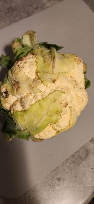 I wish shoppers had a better idea of how to pick produce. This head of cauliflower is 70% greens and 30% vegetable. At $3.99 for head head i would expect to be able to serve my family. There is only enough here for a single serving. It is nice and fresh, no mold or spots but a disappointment.