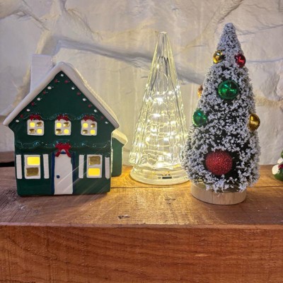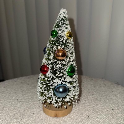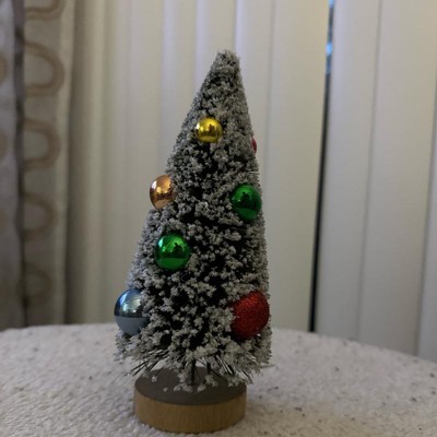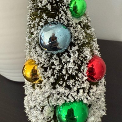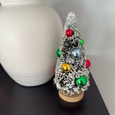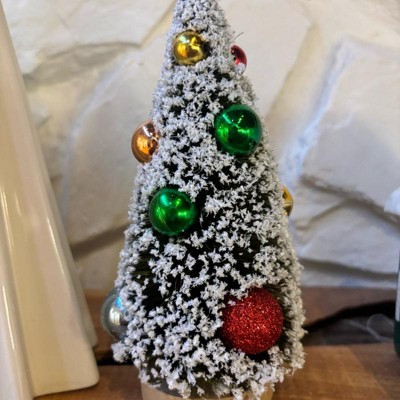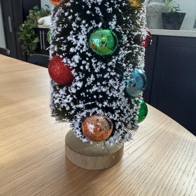 Add charming vintage appeal to your holiday decor with this Ornament Bottlebrush Tree from Threshold™. This delightful decorative piece showcases a classic bottlebrush tree in a cone silhouette with a flocked finish, adorned with vibrant ornaments for added flair. It stands atop a round pedestal base, making it perfect for tabletops, mantels, or smaller spaces where you want to create a festive ambience with a touch of nostalgic Christmas charm.