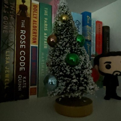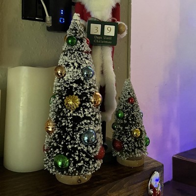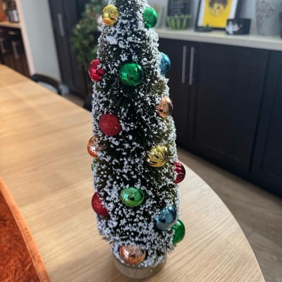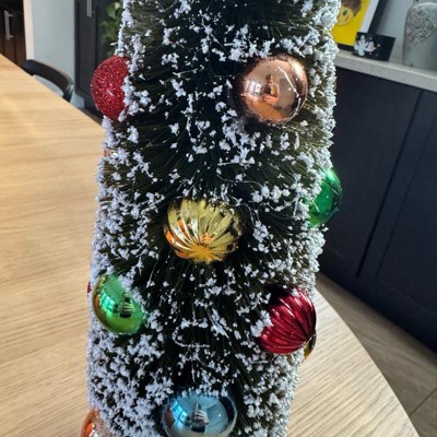 [This review was collected as part of a promotion.] This bottle brush Christmas tree decoration is super adorable and fun. This is the 15inch size. I may get the smaller size to pair with it. It’s is dark green with snow covered leaves. The snow falls off easy at first but I’m hopeful it will stop after the first year of decor. I love the Christmas balls and how shiny they are. This will go perfectly with my traditional Christmas decor.