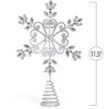 Ornativity Glittered Snowflake Tree Topper has little silver gems attached in strategic places, which add a beautiful decorative touch to the ornament. The silvery treetop decoration will glisten and reflect any lights that are hung throughout the area and will complete the winter wonderland feel you are aiming for. Because of its metallic and refined silver finish, this topper allows for the use on various themed trees. Its great quality allows for firm support on the tree and can be stored and reused. This item is made with high quality glitter to prevent the unwanted messes during the holiday season. When Christmas is over, the tree topper can act as a steady decoration for your table, shelf, or piano top. Keeping the topper as a decoration will extend the Christmas mood in your home. This medium sized metal lightweight tree topper is coated in a layer of silver glitter and has a spiral wire connected at the bottom allowing for secure attachment to a tree. The spiral is made sturdy so it can stand on a flat surface. Your holiday spirit will be enhanced to an extraordinary level with this wintery holiday item.