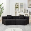 Command attention with this bold black curved sectional sofa. Upholstered in soft, textured corduroy fabric with a modular piano-key seat design. Includes pillows for comfort and requires no assembly. Perfect for creating a dramatic, modern focal point in any living room or creative space.