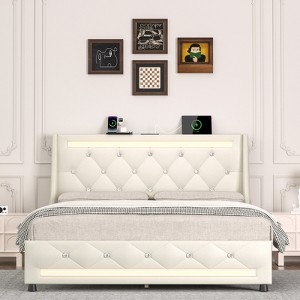 Elevate your sleep space with this luxurious full-size bed frame. Features a diamond-stitched 12" wingback headboard, built-in RGB LED lighting with app control, and an integrated charging station (AC+USB+Type-C). Enjoy under-bed storage, side pockets, and a robust slat system supporting 1200 lbs for quiet, restful nights. No box spring needed.