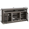 This 60" farmhouse TV stand accommodates 65" TVs with 5 cable management cutouts. Features glass doors, rich brown finish, and ample storage for media components. Versatile as entertainment center or console table. Durable wood/metal construction. Perfect for organizing living room electronics.