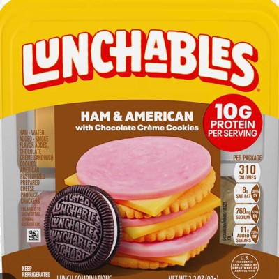 cooked ham - water added - chopped and formed - smoke flavor added (ham, water, contains less than 2% of sodium lactate, salt, modified cornstarch, potassium salts, sodium phosphates, sugar, sodium diacetate, sodium ascorbate, sodium nitrite, flavor, smoke flavor); chocolate creme sandwich cookies (enriched wheat flour [wheat flour, niacin, reduced iron, thiamine mononitrate, riboflavin, folic acid], powdered sugar [sugar, corn starch], shortening [palm oil, canola oil, modified palm oil], sugar, cocoa powder [processed with alkali], golden syrup preparation [corn syrup, sugar, water, fancy molasses, salt, potassium sorbate, caramel color], corn starch, corn syrup, corn flour, natural flavors, salt, sodium bicarbonate, soy lecithin, ammonium bicarbonate), american pasteurized prepared cheese product (milk, water, milkfat, milk protein concentrate, whey, whey protein concentrate, sodium citrate, salt, lactic acid, sorbic acid as a preservative, cheese culture, enzymes, oleoresin paprika [color], annatto [color], with sunflower lecithin added for slice separation), crackers (enriched wheat flour [flour, niacin, reduced iron, thiamine mononitrate, riboflavin, folic acid], palm oil, sugar, vegetable oil [canola, and/or soybean, and/or palm oil], contains 2% or less of salt, leavening [baking soda, ammonium bicarbonate, monocalcium phosphate], soy lecithin, natural flavors)' '
