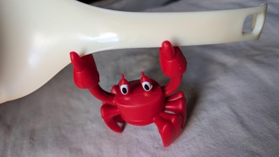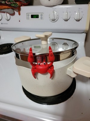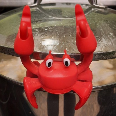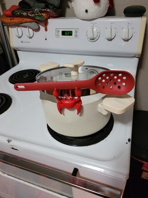 - Crab-shaped spoon rest for stove top grips pot lids with claws.