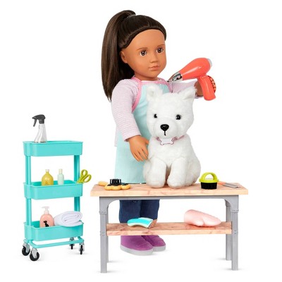 Help your dolls take fabulous care of their furry friends with the Our Generation Pet Grooming Set for 18-inch dolls! This grooming salon accessory set has everything your dolls need to pamper Pups and Pets from whiskers to tail! Dress your doll in the cute apron decorated with a puppy print to keep her clothes clean while she works. Sit your pets on the grooming table so they're easier to reach. Use the wash tub with a faucet to give your pets a bath, and the rolling cart full of grooming accessories to put on the finishing touches. Once you're all done, reward your pets with a treat to thank them for behaving so well at the grooming shop! This accessory set works well on its own or combined with the Healthy Paws Vet Clinic, Pet Store Set, and more! Discover all the great pet-themed accessories from Our Generation for more pet adventures that are paws-itively fun! The doll in the pictures is Lorelei. (Dolls and pets sold separately, available at Target. Compatible with American Girl.)