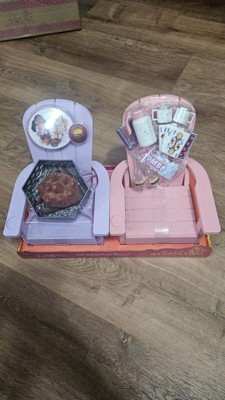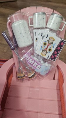 - Includes: 2 Adirondack-style chairs in pink and purple colors, a light-up fire pit with a fire sound, a bag of marshmallows, 2 camping mugs, a thermal carafe, 2 roasting sticks, 2 s'mores cookies, and a deck of playing cards.