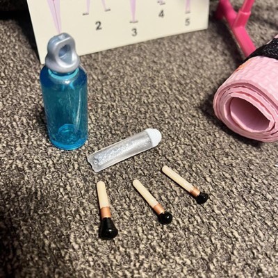 This is a cute set overall, but I could tell when I got it that glitter was leaking from the tube that came with it. There is a defect on the side of it as shown, but I'm still not even sure that's where the glitter is coming out. Someone else reported the same problem and it might be the lid. The bag that this comes with is very cute, the shoes are hard plastic so they're not the best but they fit ok. The bar is cheaply made, but is about what you can expect being a lightweight plastic. It's a fun set overall, just not the best value and some additional attention needs to be paid to details like the glitter tube to make sure it doesn't leak.