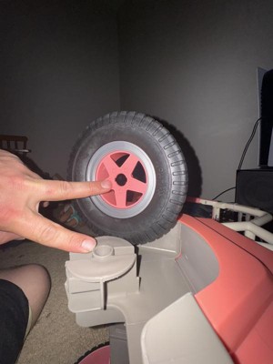 Hi DAD - We are sorry to hear that you are having an issue with one of the wheels. Please go to the Our Generation website, click on "Contact Us" then "Customer Care" and fill in the online form, asking for the piece that you are missing. We want all of our customers to be completely satisfied.