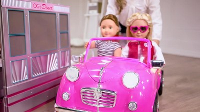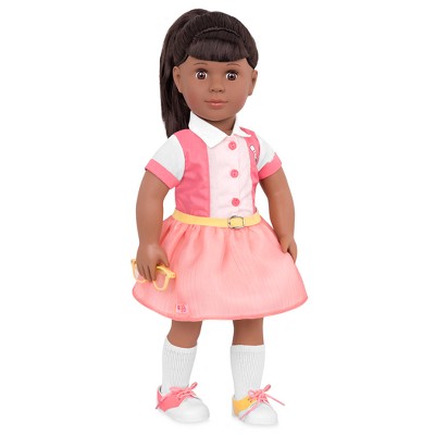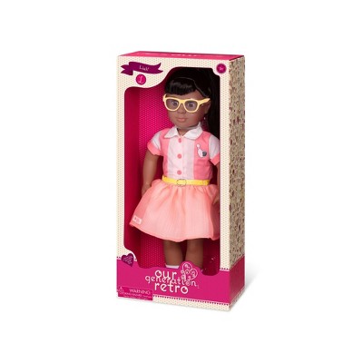 Have a playful game night with the rest of your doll collection by inviting the Our Generation 18-inch Retro doll Liah! This bowling professional has long, straight black hair tied in a ponytail that is lots of fun to brush and style, and her warm brown eyes open and close! Liah arrives wearing her favorite outfit: a striped bowling T-shirt, a casual bright-pink skirt, a yellow belt, and colorful shoes. She's ready to hit the bowling alley with her friends for a perfect night (and game)! Her outfit can be mixed and matched with other Our Generation clothes, so you can give Liah a brand-new look! (Compatible with American Girl dolls)