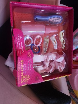 Brighten up fun hairstyles and any outfit with the Our Generation Twirls & Pearls set for 18-inch dolls! Featuring 3 super cute hair clips, 3 colored hair elastics, and a lovely pink scrunchie, this set is perfect for any creative hairstyle. Use the pearl-themed hair accessories on your doll’s pretty ponytails, twists, braids, updos, and more. The spray bottle and wire brush will keep your doll’s hair soft and tangle-free for comfortable styling, and it’s perfectly sized to complement most 18-inch dolls, outfits, and accessories. (Dolls sold separately)