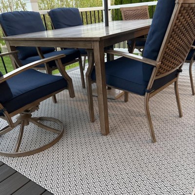 Add some contemporary flair to your patio, deck or porch with the Outdoor Diamond Rug Diamond from Threshold™. This outdoor rug is a great choice for your porch, patio or deck, and it combines an elegant look with comfortable cushioning underfoot and easy care (just rinse with a hose). The rectangular outdoor rug is decked out in an intricate diamond pattern in gray and white that will easily coordinate with your existing decor. Plus, the geo-pattern rug has a spray latex backing to help keep it in place wherever you choose to arrange it.