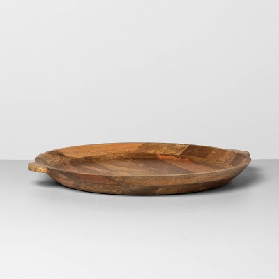 Update your serveware collection with this Oversized Carved Wood Tray from Hearth & Hand™ with Magnolia. This oversized round tray makes a charming functional addition to your kitchenware. Showcasing a mango wood construction for durability and a natural finish, it seamlessly blends with any decor. The two carved handles make for easy carrying, while the raised sides keep the tray's contents from rolling or slipping off. Whether you use it as a serving tray or just for displaying decorative vases and other items, it'll make a warm and versatile addition to your space.