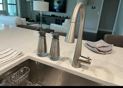 Love it! This container is stylish, meeting the modern design goals for our kitchen sink area and quite easy to operate by all ages. Replenishing the dispenser is quite easy with a twist. I ended up getting two units matching stylistically, but differing in size/capacity, with purpose to use one as dish soap and the other as hand soap. Very nice!